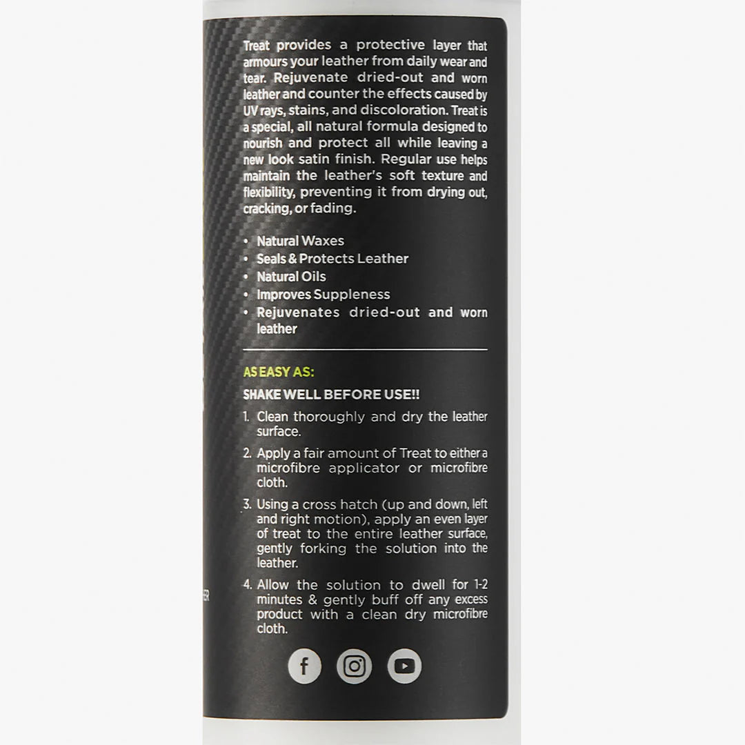 • Deep Nourishment & Rejuvenation: Formulated with natural oils and waxes, Treat penetrates deep into the leather to restore essential moisture, bringing dried-out and worn leather back to life. It helps repair the effects of UV exposure, stains, and discolouration, giving your leather a refreshed, vibrant look.